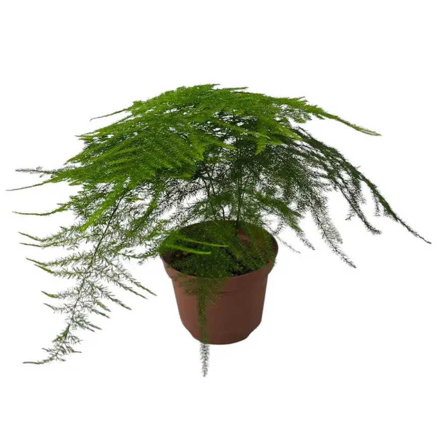 Аспарагус перистый образует изящные тонкие побеги, на которых вместо привычных листьев располагаются многочисленные плоские мягкие филлокладии — они выглядят как маленькие игольчатые перья, но на ощупь абсолютно нежные и гладкие. Побеги тонкие гибкие и разветвляются, создавая воздушную кружевную крону, похожую на тончайшее кружево или дымчатую зелень. Оттенок листвы насыщенно-зеленый или светло-изумрудный, при хорошем освещении сохраняет яркость круглый год. Молодые побеги растут активно и легко вытягиваются, придавая растению объем и легкость. Взрослые экземпляры со временем образуют густой куст с длинными побегами, которые могут слегка поникать или подниматься в стороны. Растение выглядит очень воздушно, изысканно и при этом достаточно крупно в зрелом возрасте.