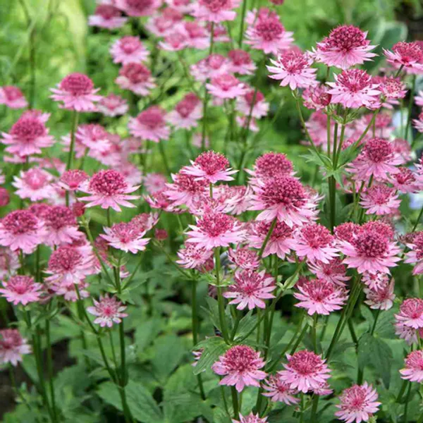 Многолетнее растение с изящными резными листьями и необычными зонтиковидными соцветиями. Цветки мелкие, розовые с серебристым оттенком, окружены прицветниками, которые придают им звездообразную форму. Цветение обильное и продолжительное, с июня по август. Декоративна в групповых посадках, миксбордерах и в качестве срезки.