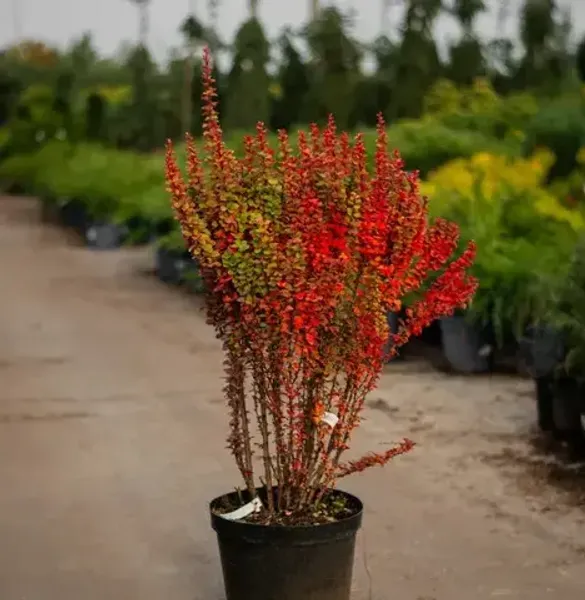 Кустарник с вертикальной колонновидной кроной. Высота взрослого растения до 1,5 м, ширина около 0,7 м. Листья пурпурные, летом сохраняют насыщенный цвет, осенью становятся ярко-алыми. Цветки жёлтые, собраны в кисти, позже появляются красные декоративные ягоды. Хорошо подходит для акцентных посадок и узких композиций.