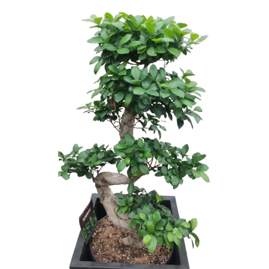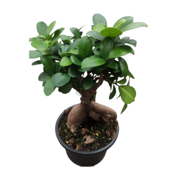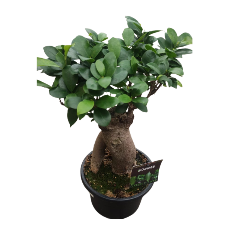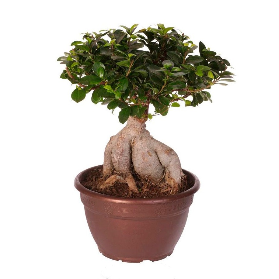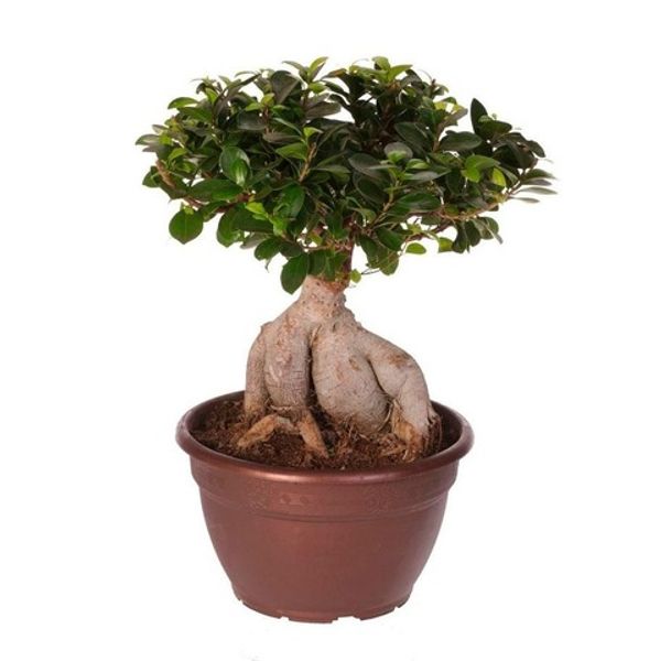 Бонсай фикус это миниатюрное деревце с утолщенным корневым основанием и аккуратной округлой кроной. Ствол может иметь естественные изгибы, придающие растению декоративный скульптурный вид. Листья маленькие, плотные, зелёные, расположены равномерно, формируя гармоничную компактную крону. Выглядит как натуральное дерево в миниатюре.