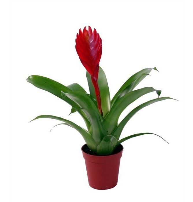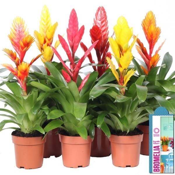 Декоративное растение с розеткой жёстких мясистых листьев ярко-зелёного цвета. Листья собраны в центр, образуя естественный резервуар для воды. Цветки крупные, яркие, появляются в центре розетки, окраска варьируется от красной до розовой и оранжевой. Бромелия эффектно смотрится как одиночный акцент или в композициях с другими декоративными растениями.