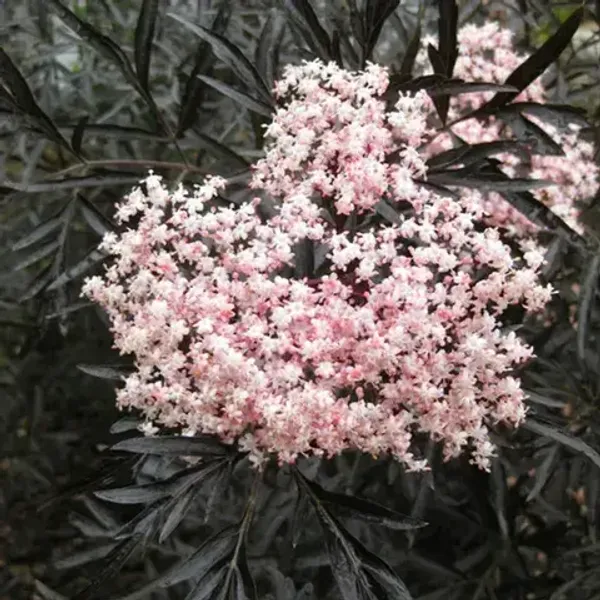 Эффектный кустарник с ажурными, тёмно-бордовыми, почти чёрными листьями, напоминающими по форме кружево. Летом цветёт розовато-белыми щитковидными соцветиями, которые красиво контрастируют с тёмной листвой. Высота до 3 м.