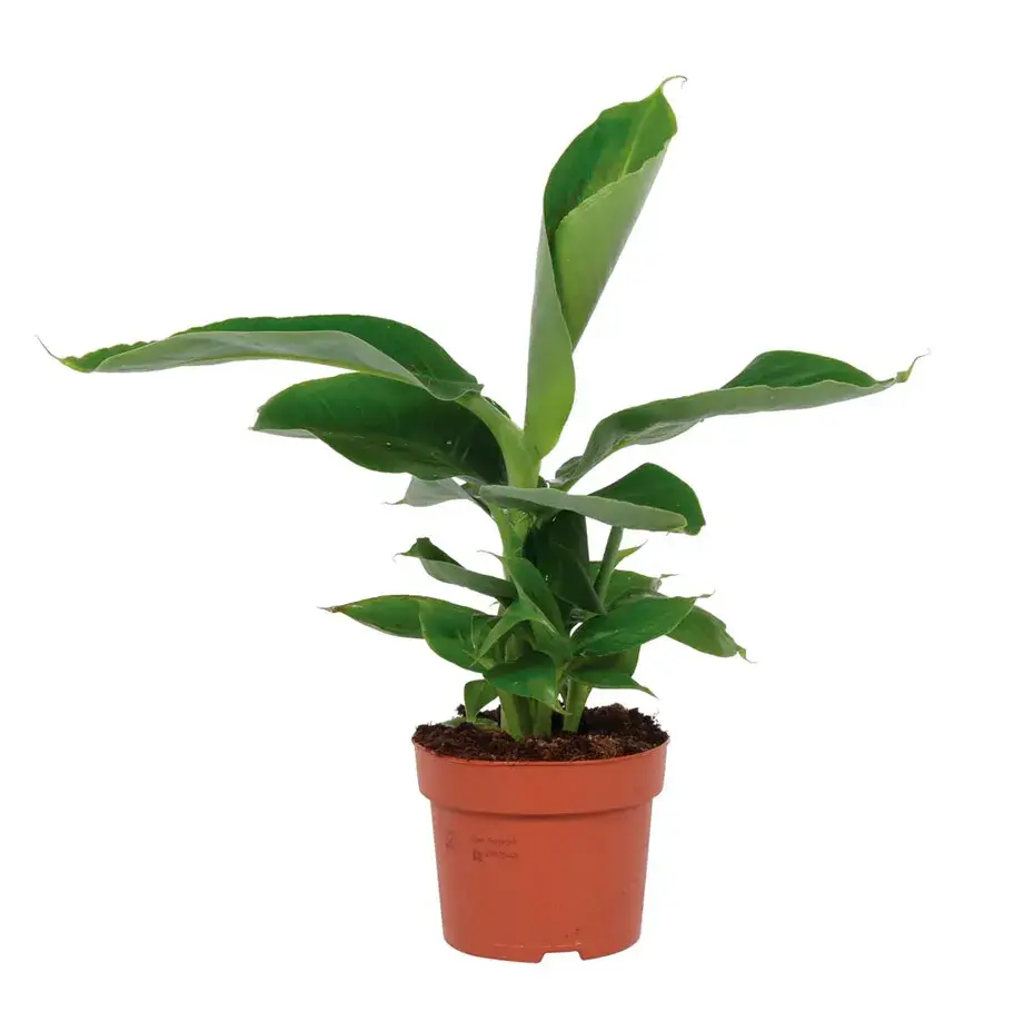Банан это крупное тропическое растение с мощными широкими листьями, которые распускаются крупными пластинами на высоких сочных стеблях. Листья светло или ярко зеленые, продолговатые, с ярко выраженной центральной жилкой. Растение формирует выразительный объем зелени и создаёт тропический акцент в интерьере. При достаточном освещении и уходе может выпускать новые листья каждую неделю, придавая кусту пышность и высоту.