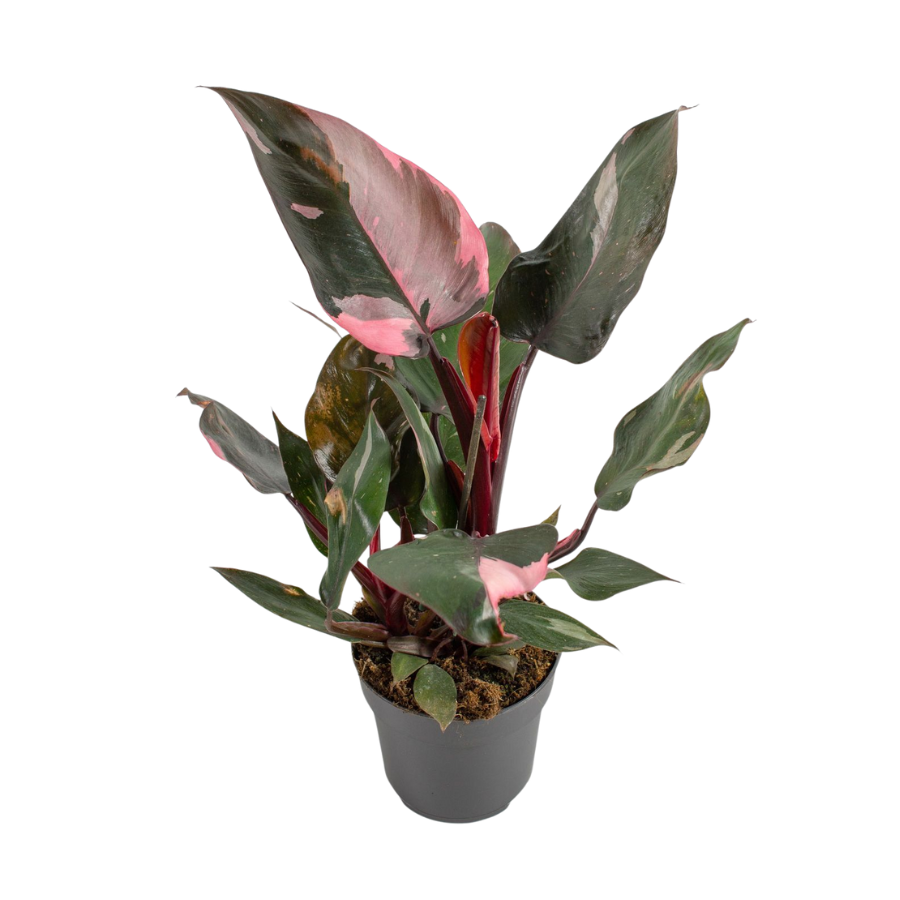 Филодендрон Pink/White Princess Редкий коллекционный сорт с крупными, плотными листьями тёмно-зелёного или почти чёрного цвета, украшенными яркими розовыми или белыми пятнами. Листья блестящие, сердцевидной формы, на длинных черешках, образуют выразительный контрастный куст. Растение растёт медленно, но стабильно, сохраняет пёструю окраску при хорошем освещении. Идеально подходит как акцентное растение в современных интерьерах.