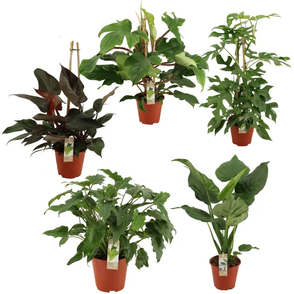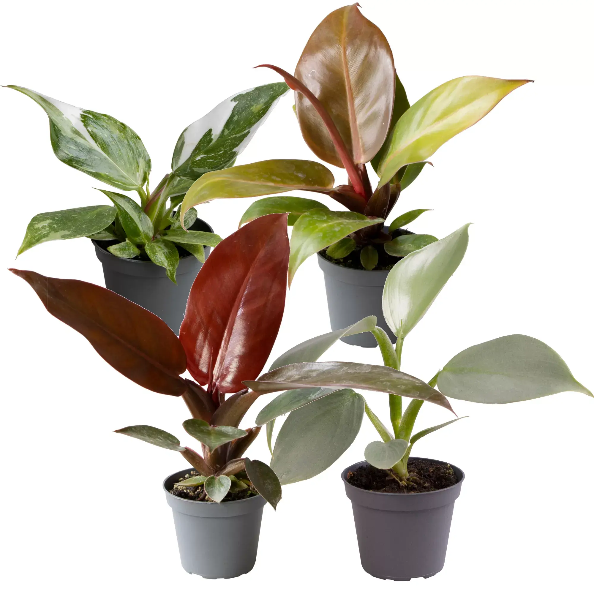 Коллекционный микс декоративных филодендронов с листьями различных оттенков — от насыщенно-зелёных до бордово-красных. Листья плотные, блестящие, овальные или сердцевидные, образуют густую пышную крону. Контраст окраски между новыми и зрелыми листьями создаёт эффект живой текстуры. Побеги прямые, иногда лиановидные, в зависимости от разновидности. Растение быстро растёт, хорошо кустится и подходит для современных композиций с экзотическим акцентом.