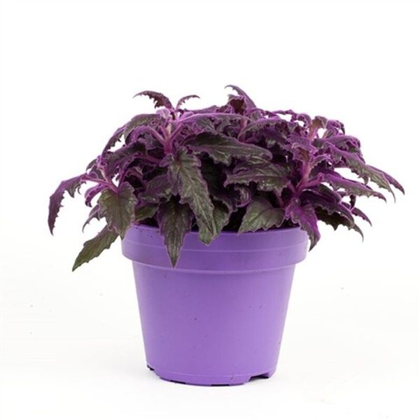 Гинура это декоративное растение с бархатистыми листьями насыщенно зеленого цвета, покрытыми густым фиолетовым опушением, которое создаёт эффект светящегося пурпурного оттенка. Листья удлиненные, с мягкими зубчатыми краями, побеги могут свисать, формируя яркий акцент за счет контрастной окраски.