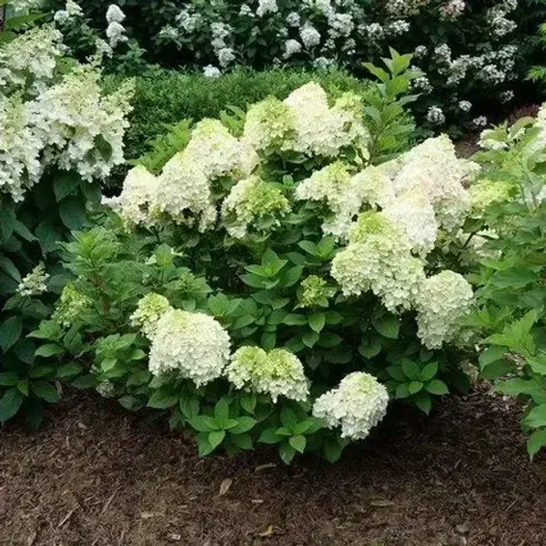 Карликовый сорт высотой 50–80 см с округлой плотной кроной. Листья тёмно-зелёные, небольшие. Соцветия крупные для компактного кустика — до 15–20 см, белоснежные, сохраняют декоративность до осени. Цветёт с июля по сентябрь. Отличный выбор для небольших садов, бордюров и контейнерного выращивания.