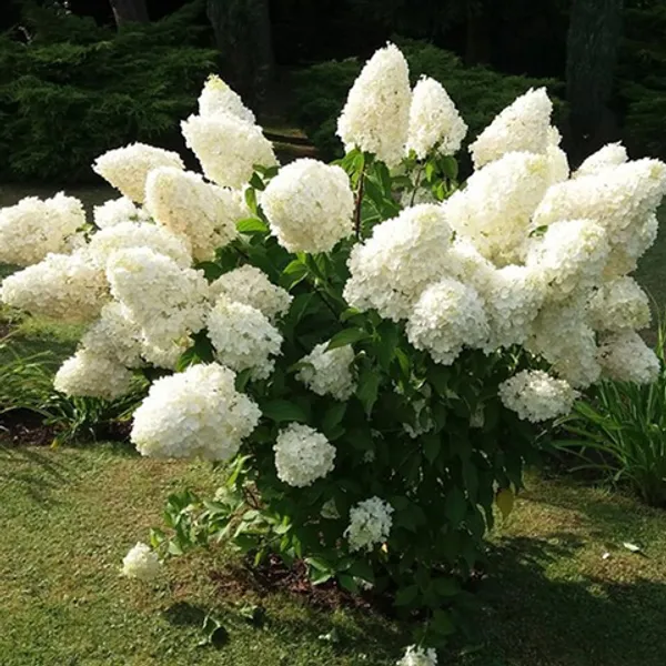 Крупный прямостоячий куст до 2–2,5 м с мощными побегами светло-коричневого оттенка у молодых приростов. Листья крупные, овальные, насыщенно-зелёные, плотные, длиной 12–18 см, с мелкой зазубренной кромкой. Соцветия крупные, пирамидальные, длиной 30–35 см, белые, к концу сезона кремово-розовые. Цветение обильное, декоративность сохраняется длительно. Устойчива к ветру, дождю и кратковременной засухе.