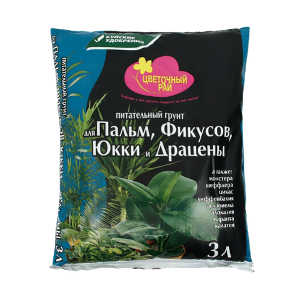 Почвогрунт полностью готов к использованию, специально разработан для тропических и субтропических комнатных растений: пальм, фикусов, юкки, драцены и других декоративно‑лиственных культур.