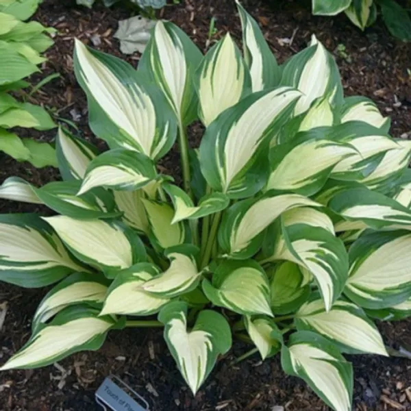 Эффектный сорт с крупными продолговатыми листьями с кремово-жёлтым центром и широкими зелёными краями. Листья плотные, слегка волнистые по краю, образуют аккуратный раскидистый куст. Цветки лавандово-сиреневые, собраны в соцветия на высоких цветоносах. Цветёт в июле–августе. Используется в миксбордерах, теневых композициях и для контейнерного озеленения.