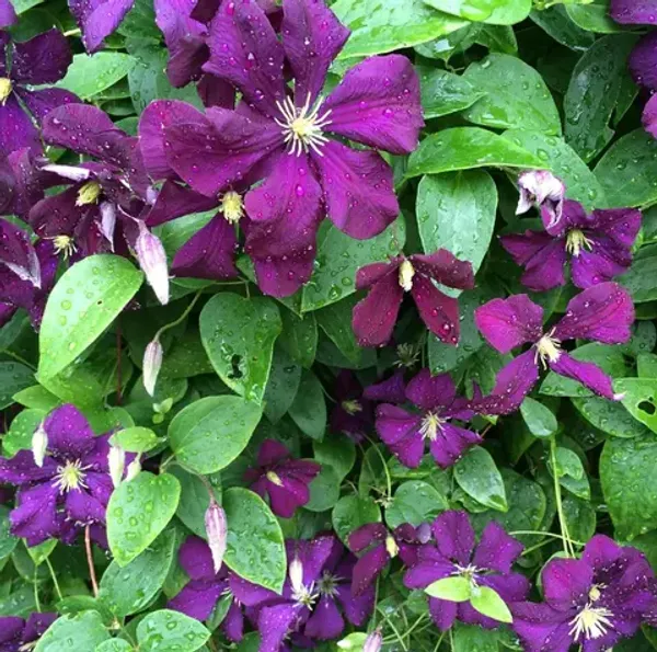 Лиана с крупными цветками до 15 см в диаметре. Лепестки бархатистые, тёмно-фиолетовые, с волнистыми краями. Цветение начинается в июне и продолжается до сентября, особенно обильно в июле. Листья зелёные, сердцевидные, создают плотный декоративный фон. Прекрасно смотрится на шпалерах, арках и стенах.