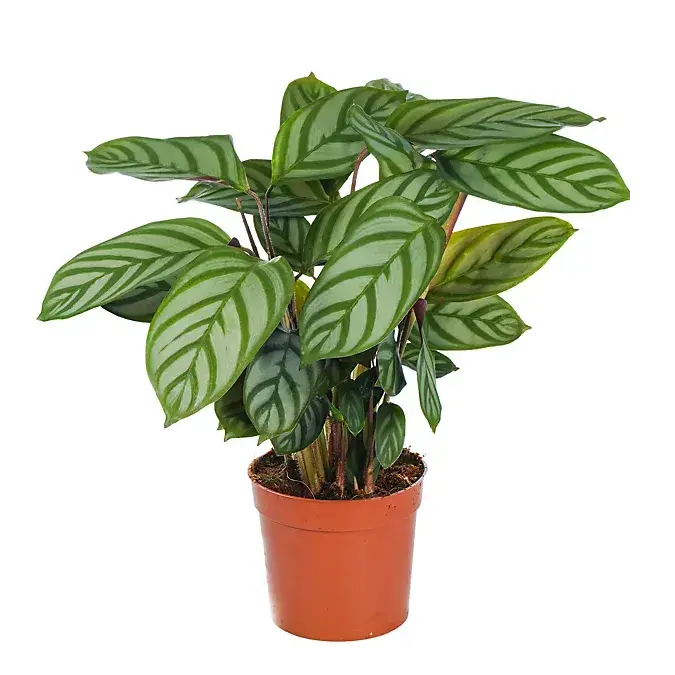 Крупномерное декоративное растение с крупными овальными листьями насыщенно-зелёного цвета с ярко выраженным рисунком или полосами на поверхности. Листья могут слегка сворачиваться вечером, демонстрируя декоративные свойства. Побеги прямые, листья образуют эффектную декоративную крону средней плотности, создавая тропический акцент в интерьере.