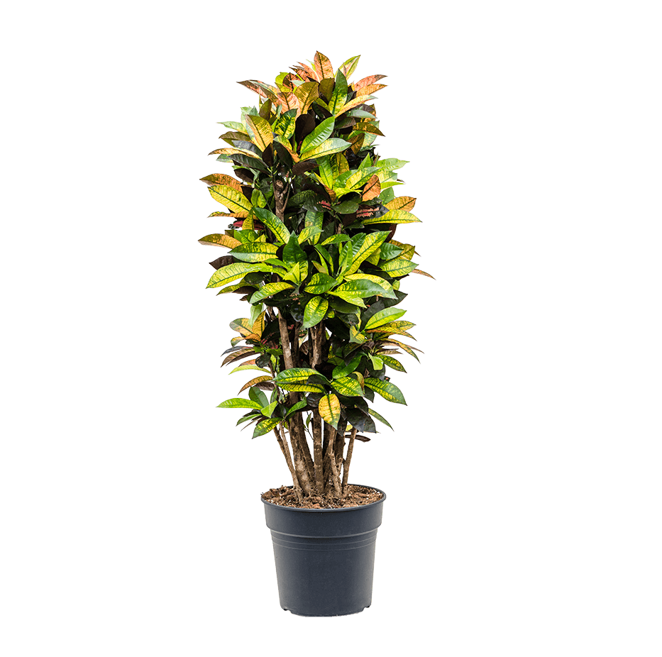 Крупное декоративное растение с яркими, разноцветными листьями — зелёными, жёлтыми, красными или оранжевыми. Листья плотные, длинные, слегка изогнутые, образуют декоративную крону с выразительной окраской. Стволы прямые, поддерживают плотную и эффектную композицию. Отлично подходит для просторных интерьеров.
