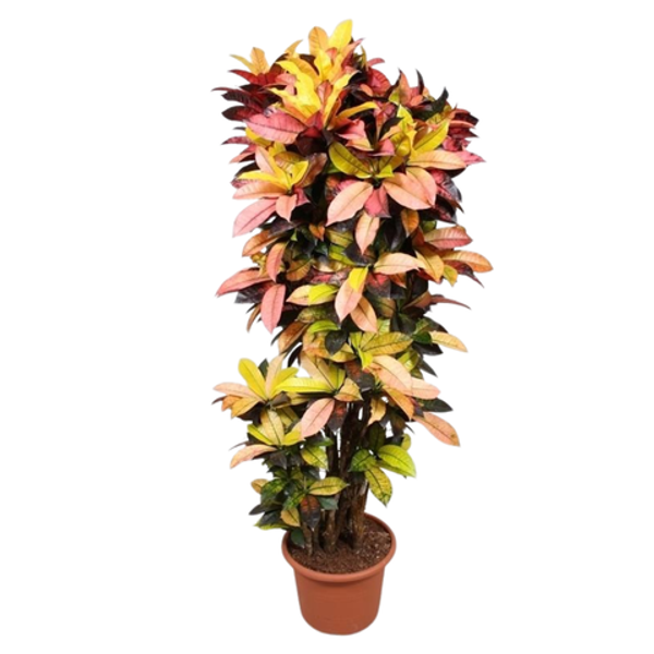 Крупное декоративное растение с яркими, разноцветными листьями — зелёными, жёлтыми, красными или оранжевыми. Листья плотные, длинные, слегка изогнутые, образуют декоративную крону с выразительной окраской. Стволы прямые, поддерживают плотную и эффектную композицию. Отлично подходит для просторных интерьеров.