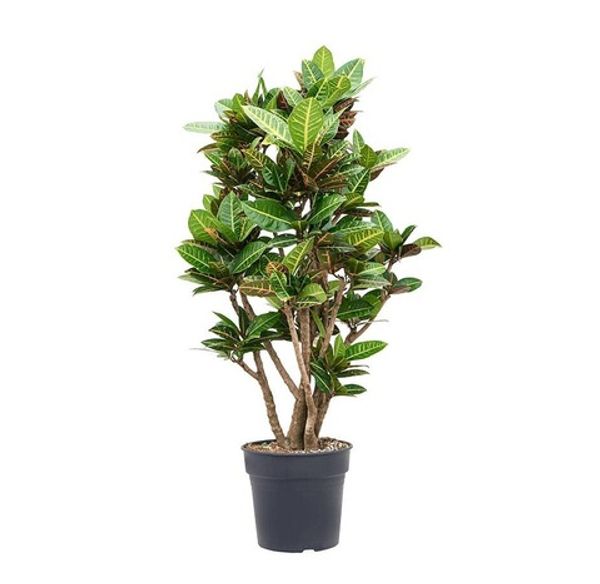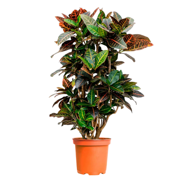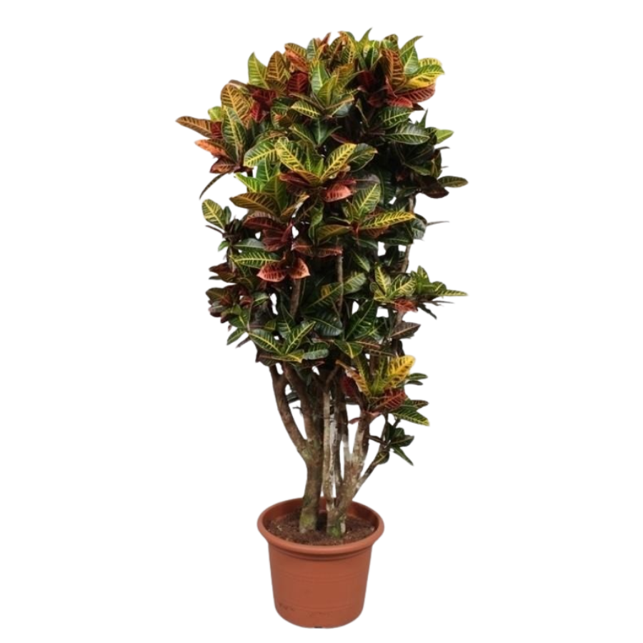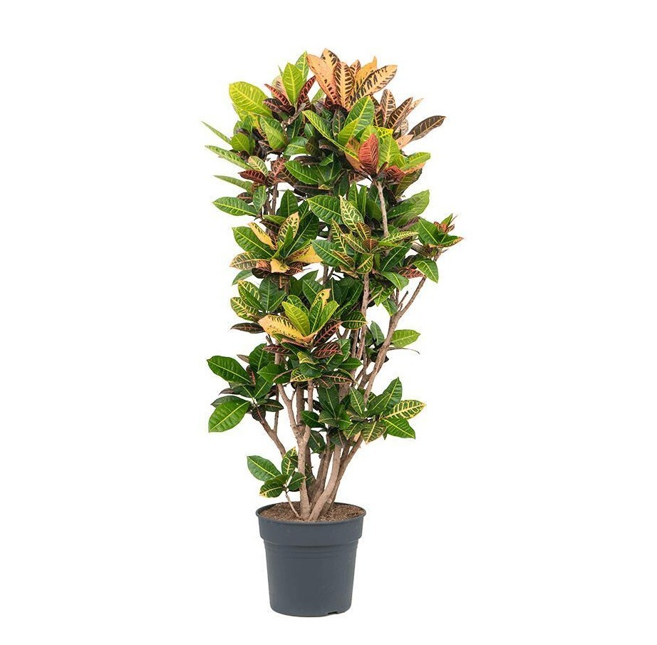 Крупное декоративное растение с яркими, разноцветными листьями — зелёными, жёлтыми, красными или оранжевыми. Листья плотные, длинные, слегка изогнутые, образуют декоративную крону с выразительной окраской. Стволы прямые, поддерживают плотную и эффектную композицию. Отлично подходит для просторных интерьеров.