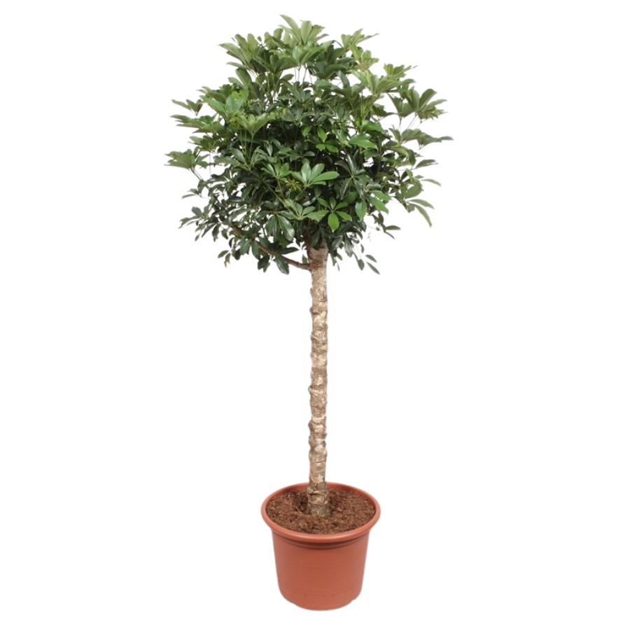 Крупное декоративное растение с прямым или слегка изогнутым стволом и крупными пальчатыми листьями насыщенно-зелёного цвета. Листья плотные, глянцевые, растут пучками, формируя густую декоративную крону. Растение устойчиво к интерьерным условиям, легко переносит формовку и подрезку, создавая аккуратную композицию.