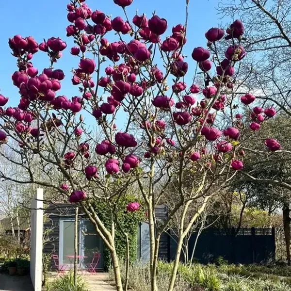 Декоративный кустарник или небольшое дерево высотой 3–5 м и шириной до 3 м. Цветы крупные, бокаловидные, насыщенно-пурпурные, почти чёрно-бордовые, диаметром до 15 см. Цветение раннее, в апреле–мае, до распускания листьев. Листва крупная, тёмно-зелёная, осенью становится золотистой. Используется как эффектный акцент в саду, в одиночных посадках и рядом с террасами.