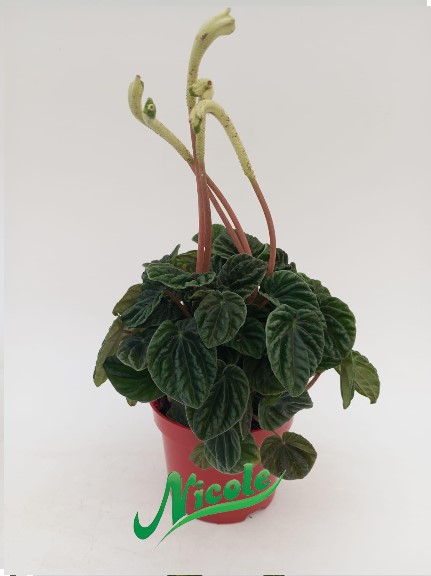 Пеперомии, в том числе Пеперомия сморщенная - низкорослые кустистые растения с темно-зелеными, волнистыми в данном случае, листьями и цветущая очень необычными похожими на мышиные хвостики бело-зелеными цветоносами. Пеперомии - миниатюрные родственники перца.