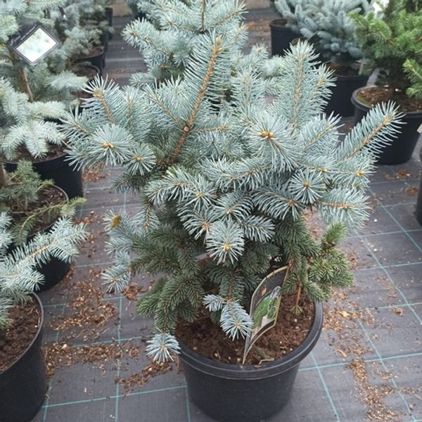 Эффектная форма голубой ели с ширококонической кроной. Молодые приросты кремово-белого оттенка, которые со временем становятся голубыми, создают красивый контраст. Хвоя колючая, плотная, серебристо-голубая. Вырастает до средней высоты, используется как акцентное растение.