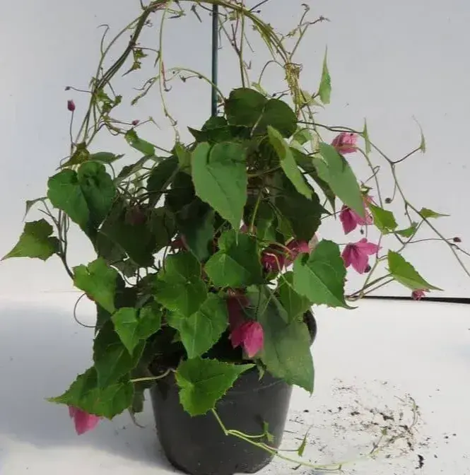 Изящное ампельное или вьющееся растение с тонкими гибкими побегами и необычными колокольчатыми цветами насыщенного пурпурно-фиолетового оттенка. Цветы имеют длинные свисающие трубочки и декоративные прицветники, создавая эффект «висящих фонариков». Листья округлые, мягкие, насыщенно-зелёные с лёгким глянцем, на длинных черешках. Родохитон активно растёт в тёплый сезон, образуя пышные ниспадающие побеги, особенно эффектен в подвесных кашпо или на опорах. Любит хорошее освещение и влажность воздуха, но не выносит застоя воды.