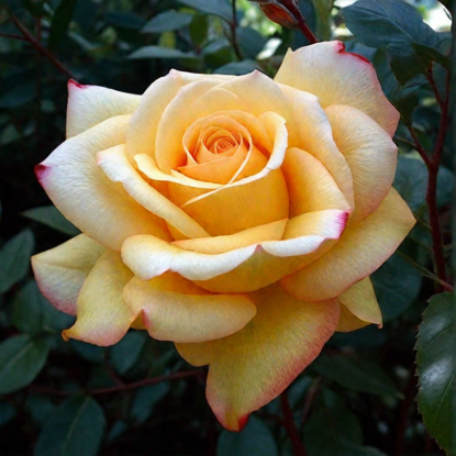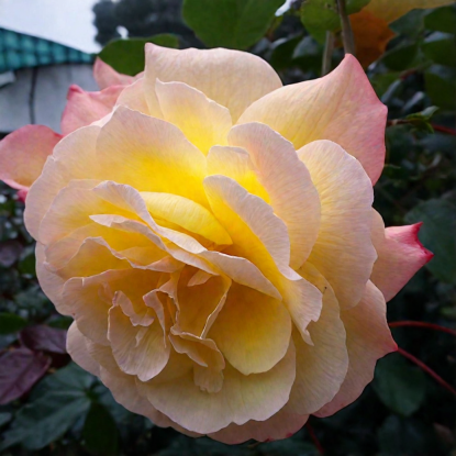 Catherine Laborde — чайно-гибридная роза с крупными густомахровыми цветками тёплого жёлтого оттенка с розово-карминовым краем. Цветки очень крупные, выразительные, с сильным фруктово-цитрусовым ароматом. Куст прямостоячий, аккуратный, обычно около 80–130 см высотой, подходит для парадных посадок, розариев и срезки. Уверенность: 95%.