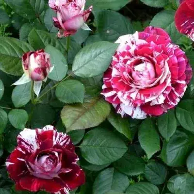 Роза с крупными густомахровыми цветками диаметром до 12 см, окрашенными в необычную кремово-малиновую гамму с полосками и штрихами. Аромат яркий, фруктовый, с нотами цитрусов. Цветение повторное, обильное. Куст высотой до 120 см, густой, с тёмной блестящей листвой. Используется для срезки и ярких цветников.