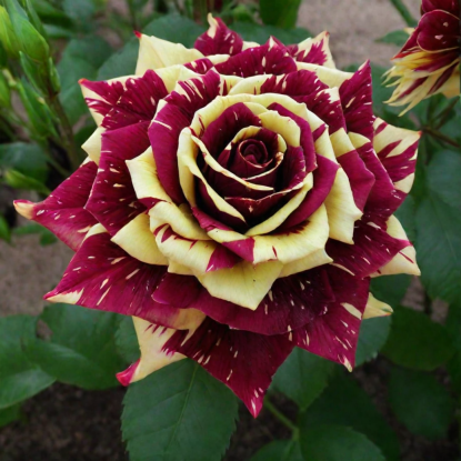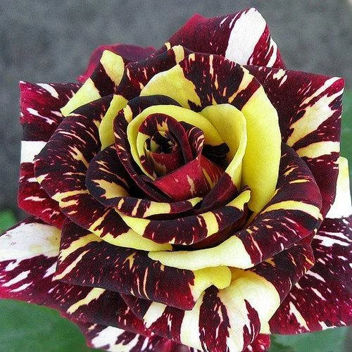 Роза Abracadabra — эффектный декоративный сорт с необычной пёстрой окраской лепестков: на тёмно-красном или бордовом фоне появляются жёлтые, кремовые или беловатые полосы и штрихи. Куст компактный, аккуратный, подходит для клумб, розариев и посадки как яркий акцент. Цветение повторное, цветки заметные и очень выразительные, с «театральным» рисунком.