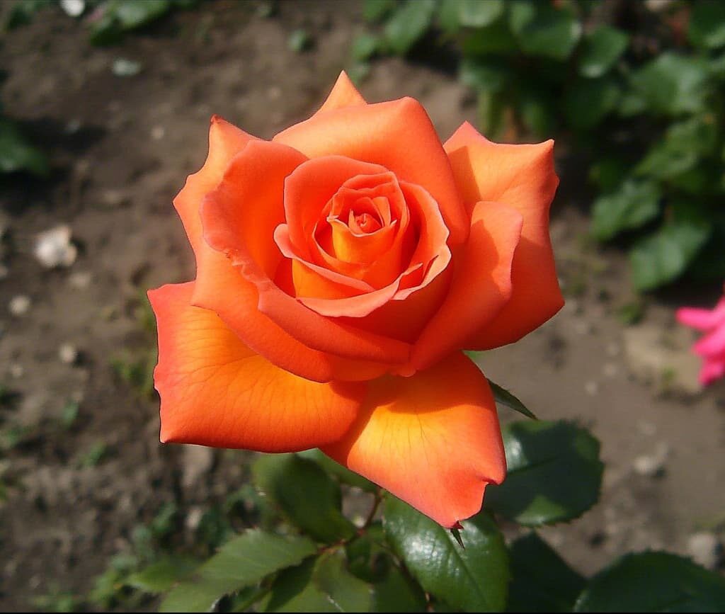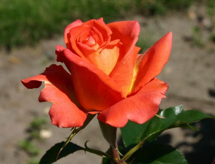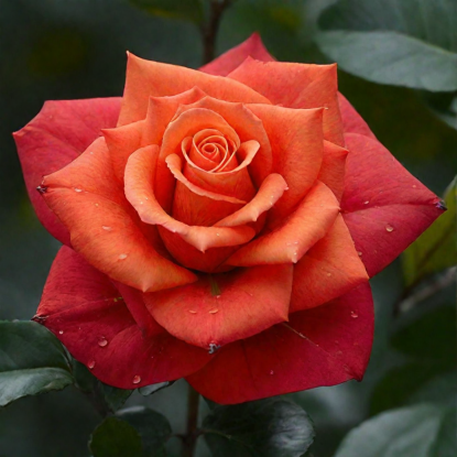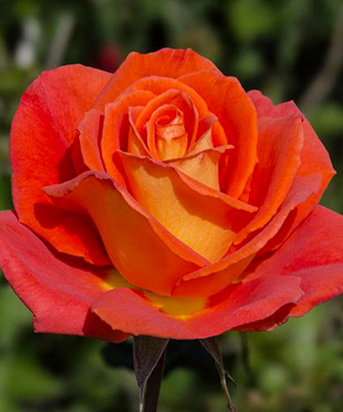 Роза Моника — яркая чайно-гибридная роза с высоким прямостоячим кустом, который обычно вырастает примерно до 80–120 см, а в хороших условиях может быть и выше. Цветки крупные, около 8–11 см, классической формы, оранжево-красные или алые с золотисто-жёлтой изнанкой лепестков. Сорт выглядит очень нарядно, хорошо подходит для срезки, розариев, заднего плана цветника и живой изгороди.
