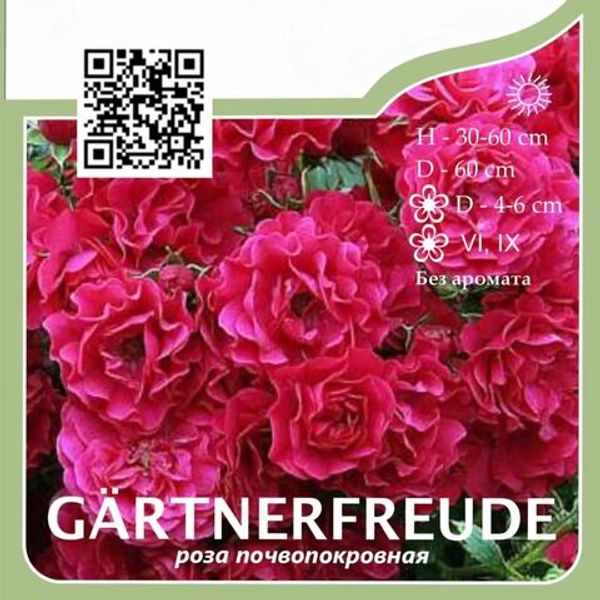 Почвопокровная роза с яркими малиновыми махровыми цветками диаметром 4–5 см, собранными в обильные кисти. Цветение продолжительное, повторное, с июня до осени. Куст густой, раскидистый, высотой до 60 см и шириной до 100 см. Листья блестящие, устойчивые к заболеваниям. Используется для ковровых посадок, склонов и бордюров.