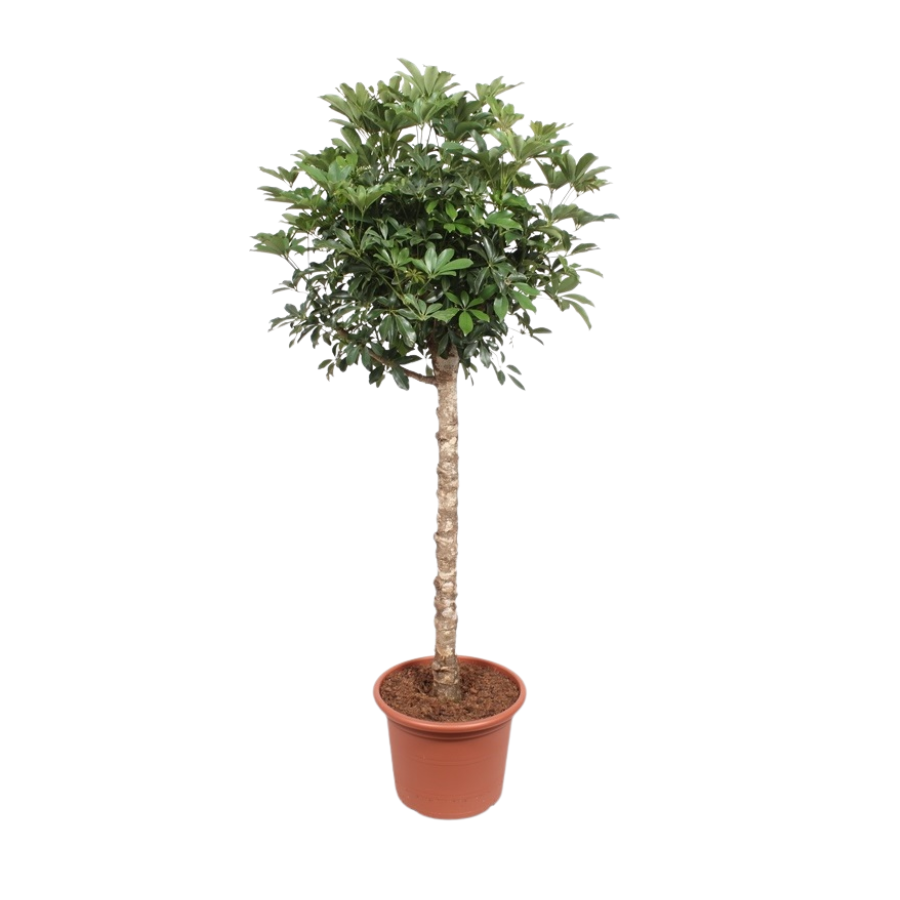 куст с пальчатыми листьями насыщенно-зелёного цвета, образующими пышную крону. Листья глянцевые, овальные, с заострёнными концами, стебли прочные. Растение медленно растёт, хорошо переносит формовку и подходит для штамбовых форм. Отлично подходит для интерьеров с минималистичным дизайном.