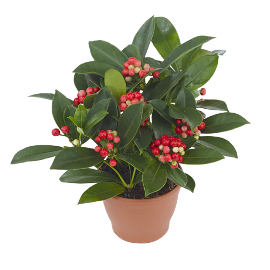 Вечнозелёное декоративное растение с плотными овальными листьями насыщенно-зелёного цвета и ароматными соцветиями белых или розоватых цветков. После цветения образует ярко-красные ягоды, сохраняющиеся на растении всю зиму, что придаёт ему особую декоративность. Листья кожистые, блестящие, куст густой и компактный. Скимия прекрасно смотрится как в помещении, так и на террасах, любит прохладу и стабильную влажность.