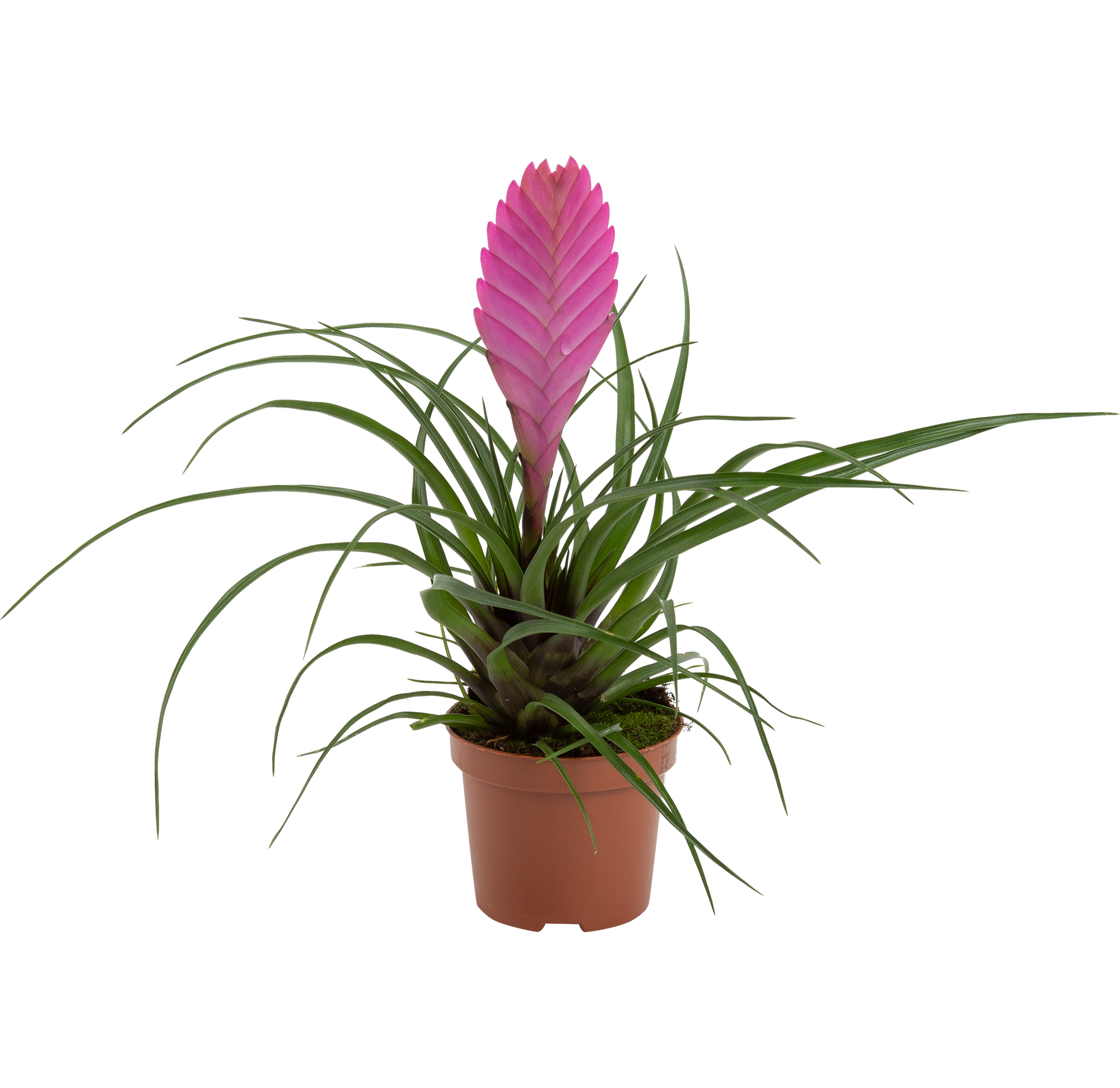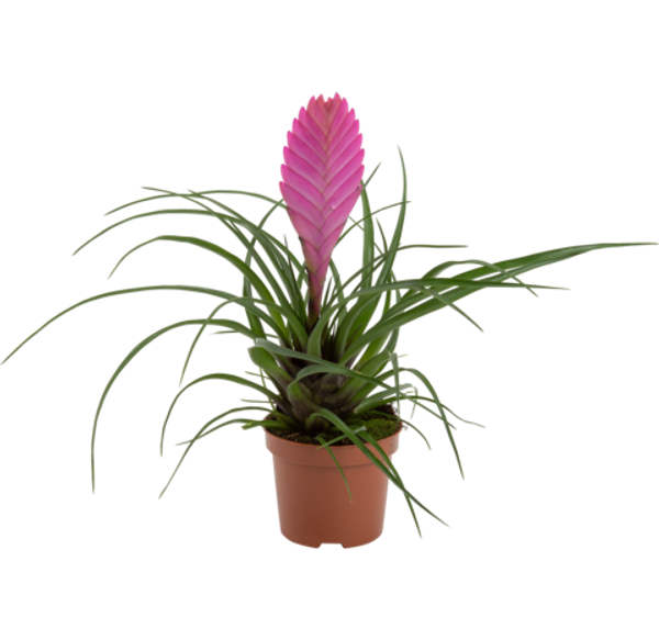 Эпифитное декоративное растение с тонкими, изогнутыми, серебристо-зелёными листьями, собранными в розетку. Листья жесткие, покрыты специализированными чешуйками (трихомами), которые позволяют растению поглощать влагу и питательные вещества из воздуха. Растение не нуждается в почве, эффектно смотрится на корягах, камнях или в декоративных композициях. Цветки появляются в центре розетки, яркие, красные, фиолетовые или розовые, создавая декоративный акцент.
