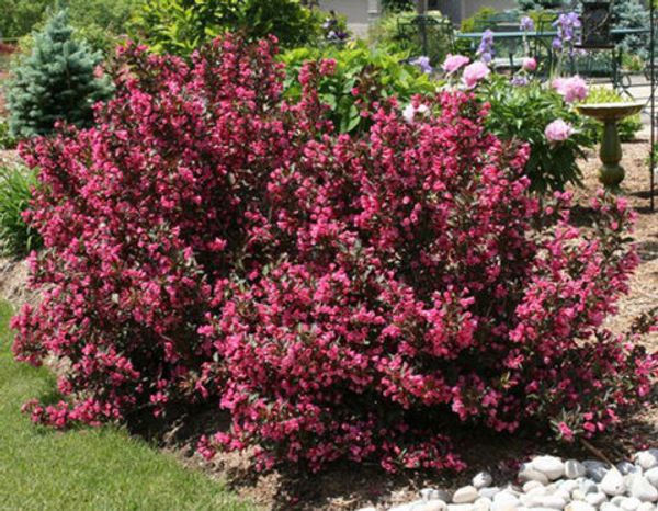 Декоративный кустарник с компактной кроной и бордовыми листьями, которые сохраняют цвет весь сезон. Цветы колокольчатые, розовые, собраны в соцветия, появляются в начале лета и могут повторно цвести в августе. Высота до 1,5 м.