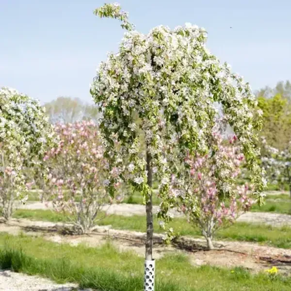 Плакучая форма яблони высотой до 4–5 м с длинными поникающими ветвями. Цветки белые, обильные, в мае, обладают лёгким ароматом. Плоды ярко-красные, шаровидные, диаметром 2–3 см, декоративны до зимы. Листва зелёная летом, осенью — золотистая. Используется как солитер или акцент в композициях.